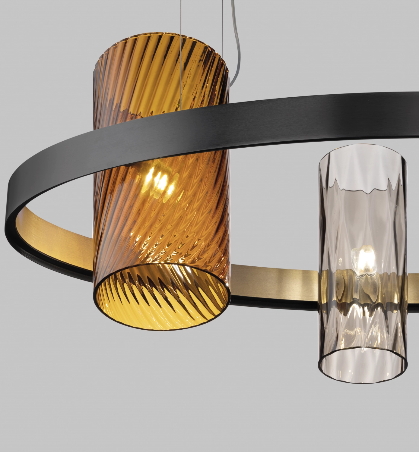 The ARMONIA pendant is a distinctive decorative luminaire that blends glass and metal to create a striking architectural feature.