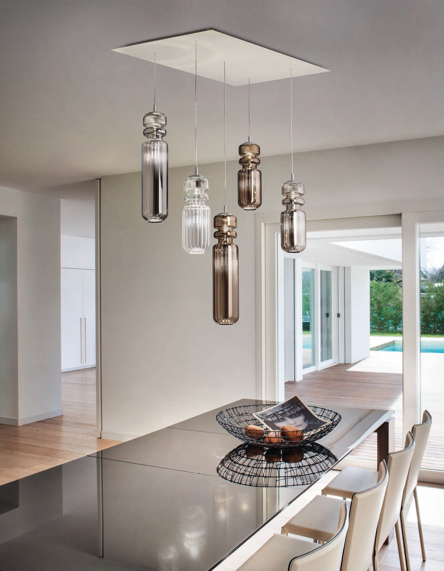 Available in transparent, bronze, violet, and titanium finishes, these lamps bring sophistication and modern elegance to any space.