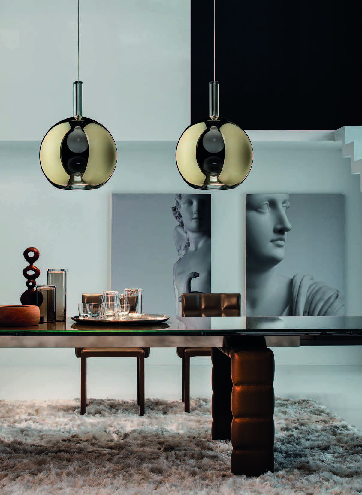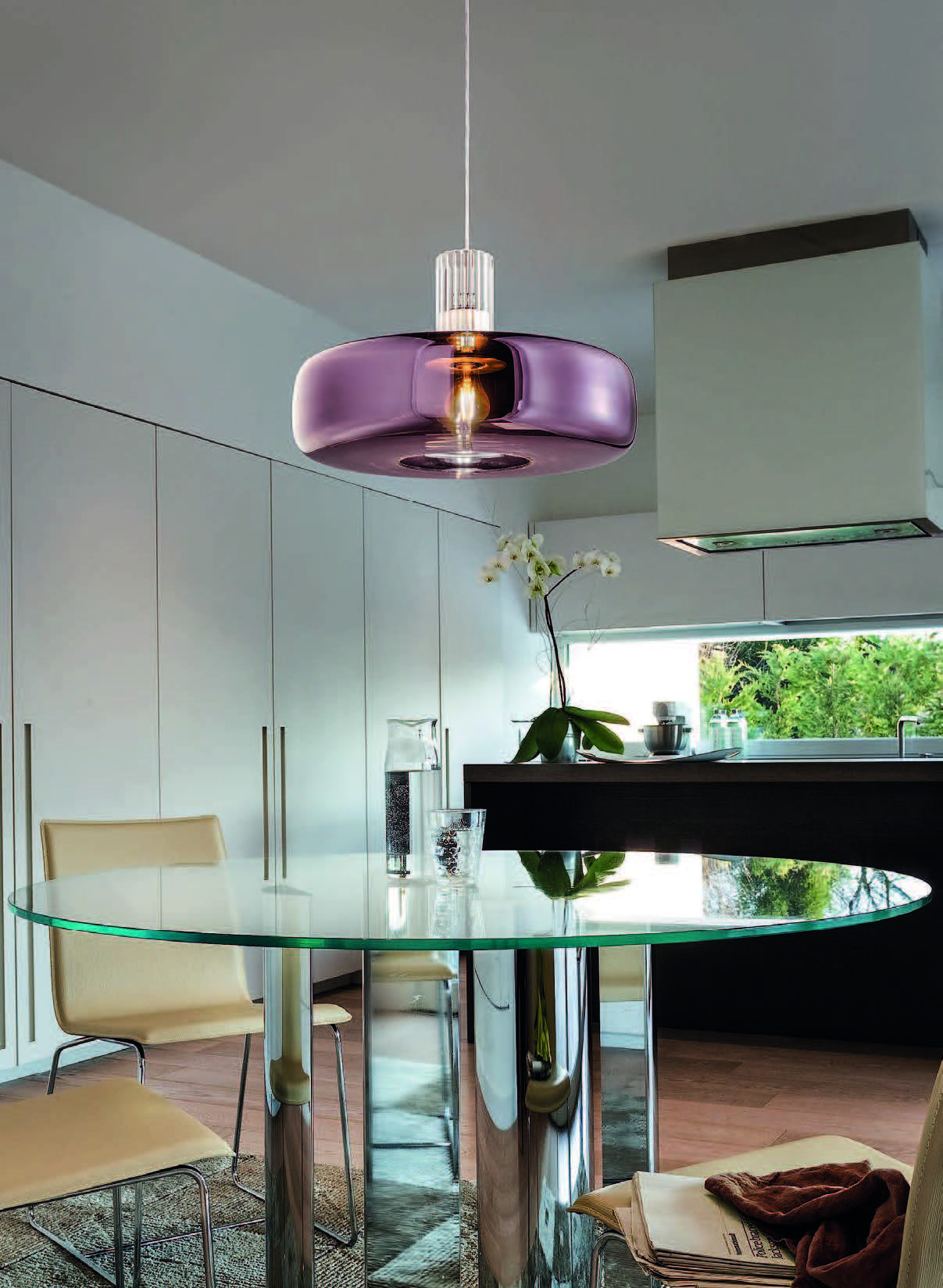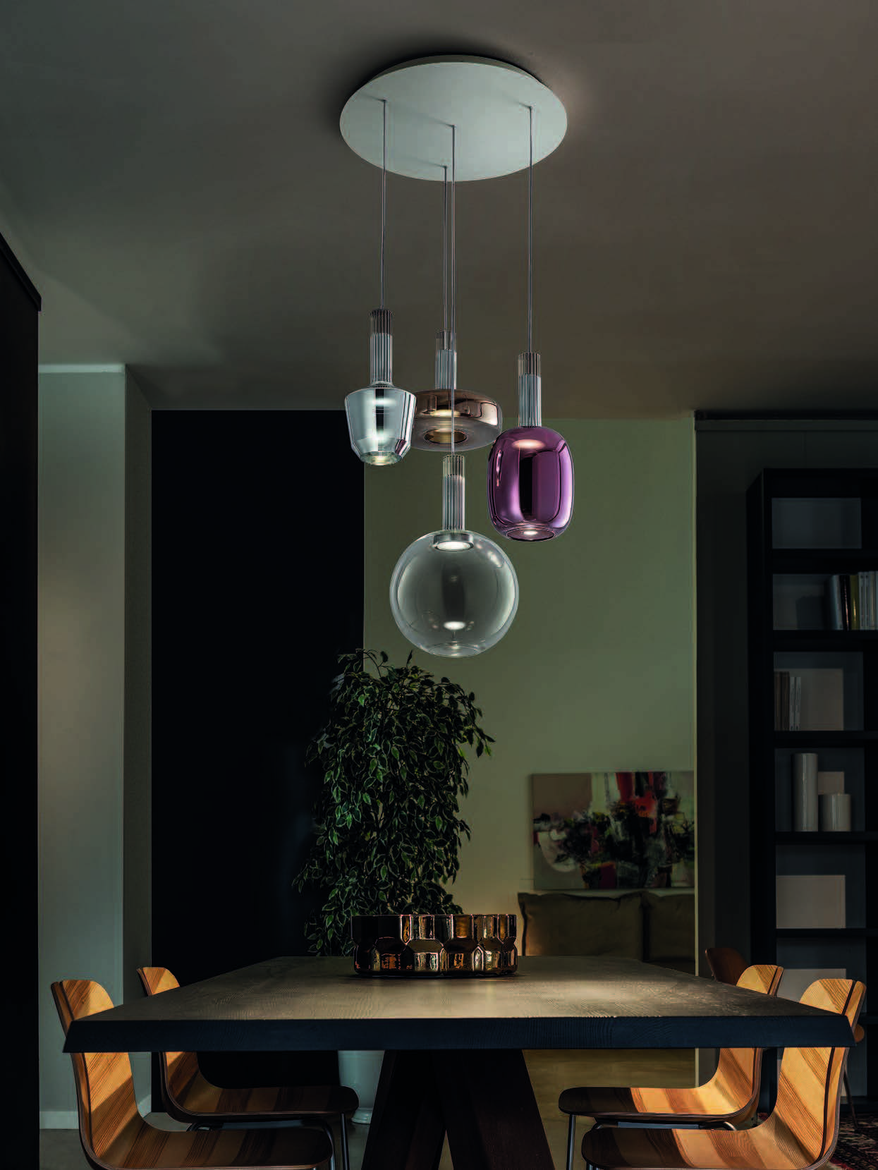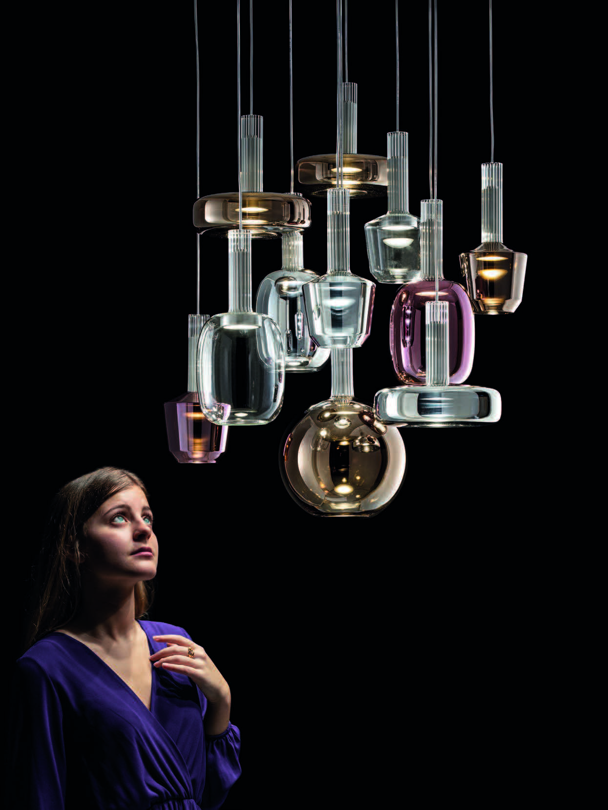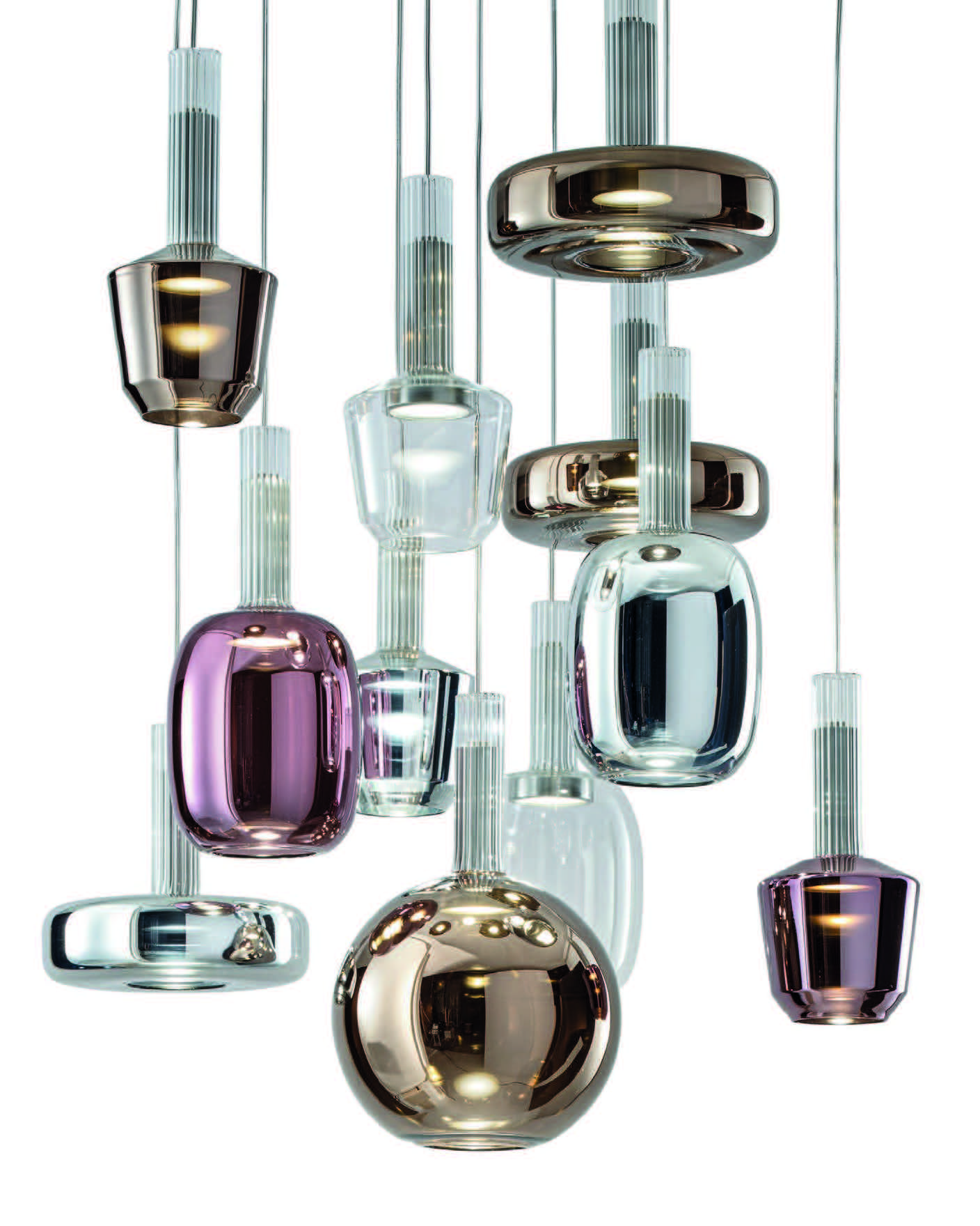 The Ecletica collection offers six models made of glass, available in pendant, floor, and wall configurations.