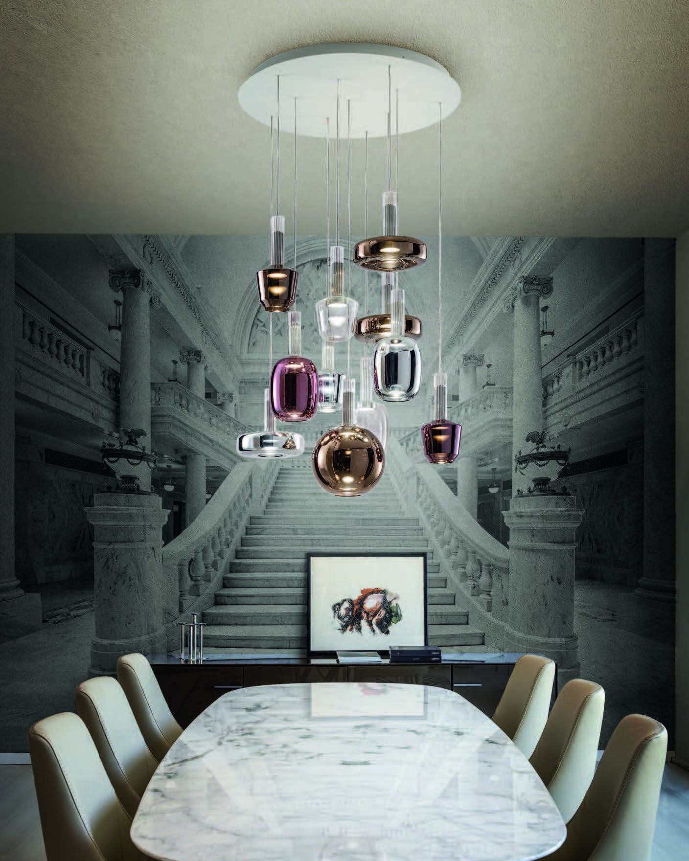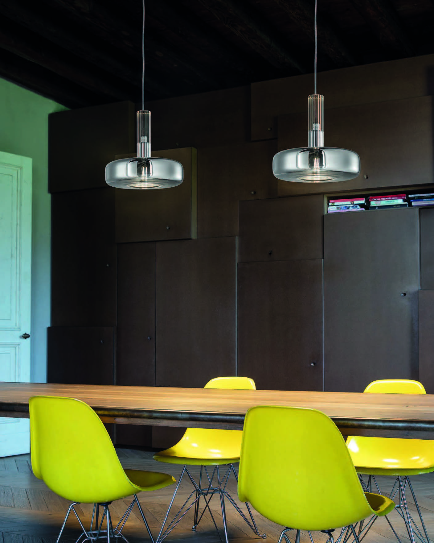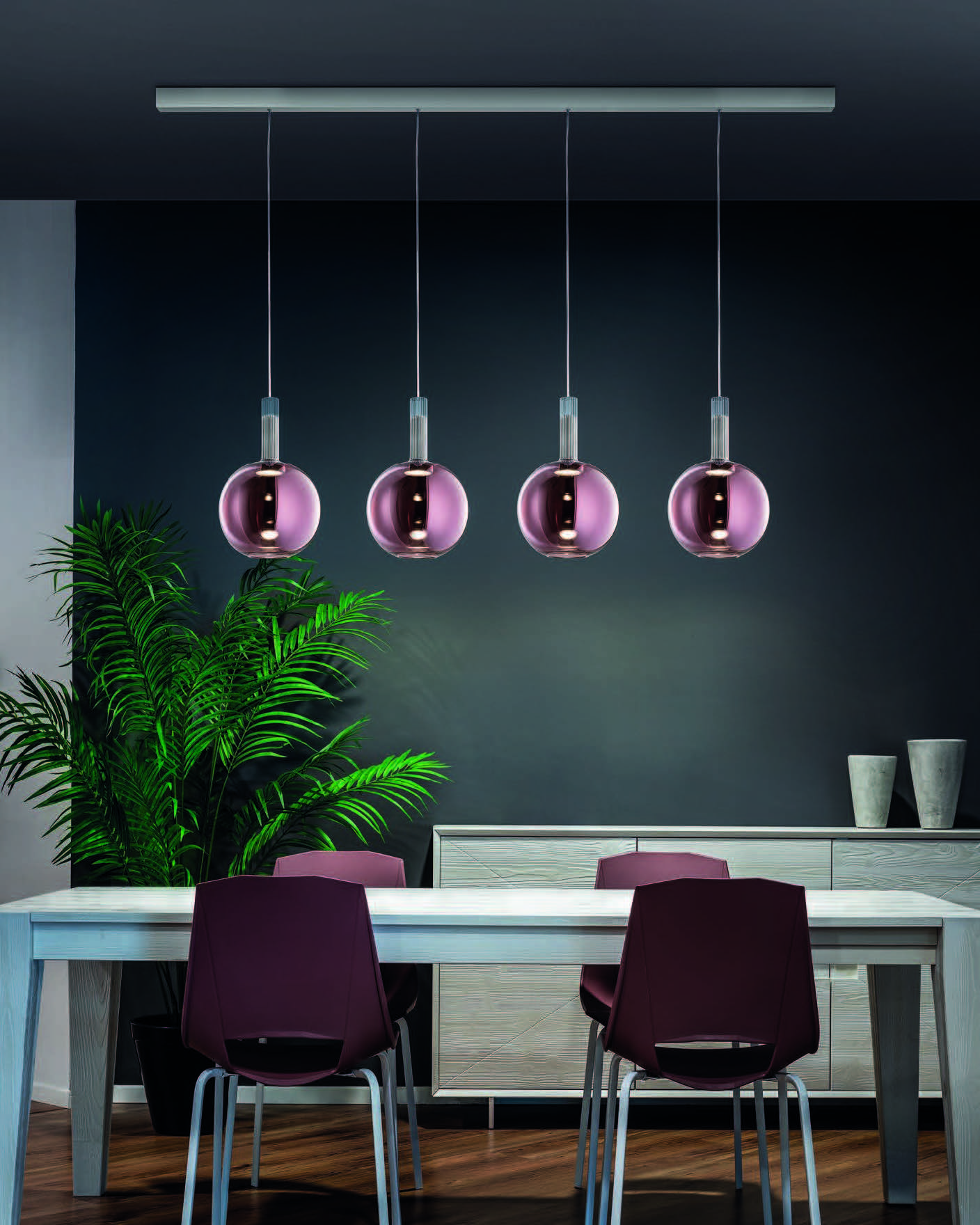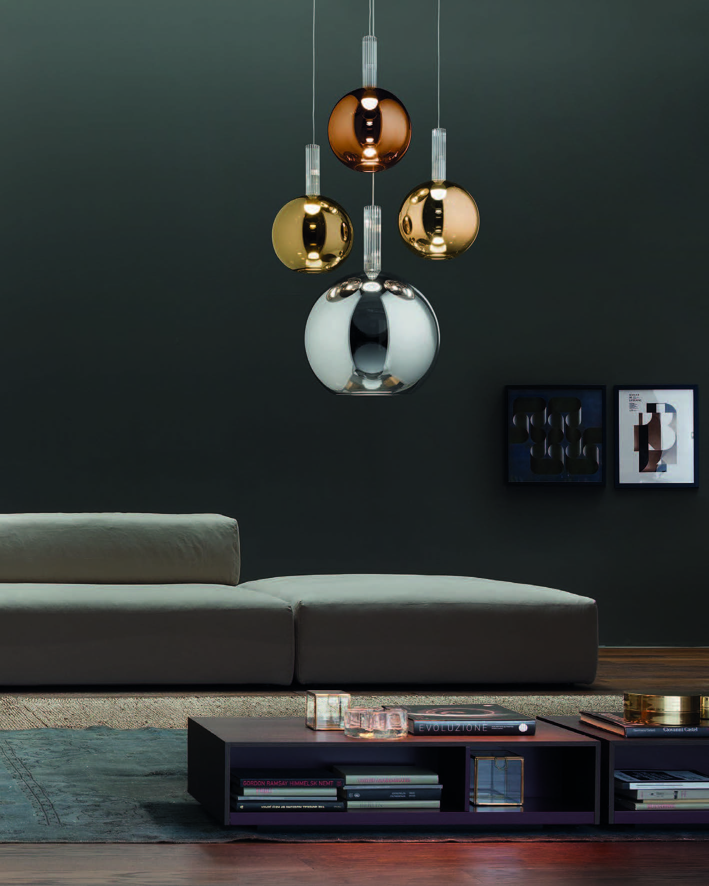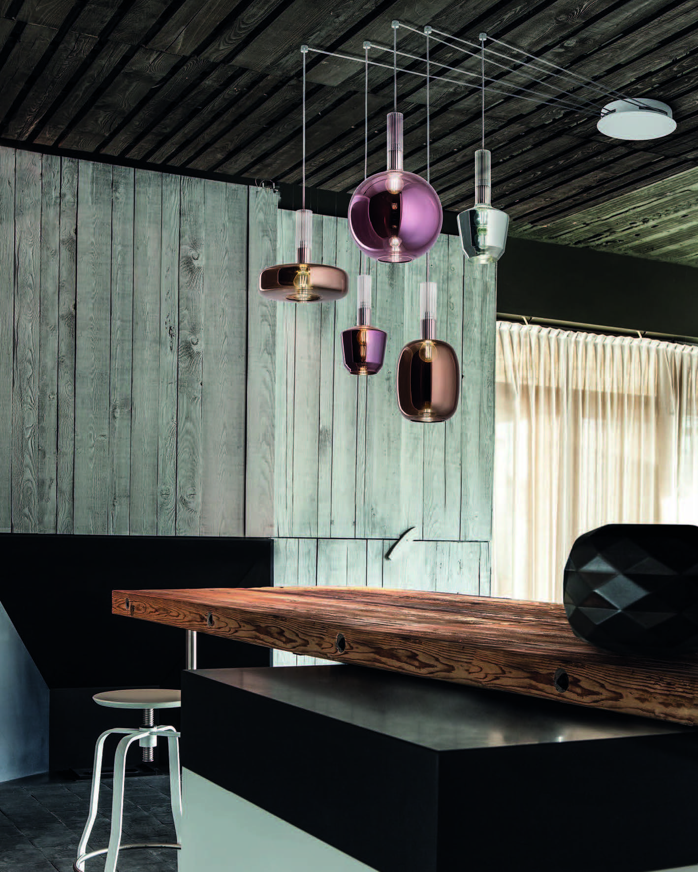 The Ecletica collection offers six models made of glass, available in pendant, floor, and wall configurations.