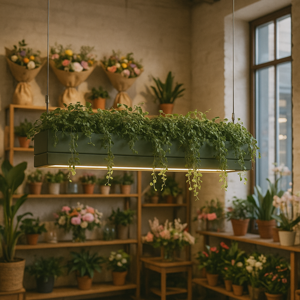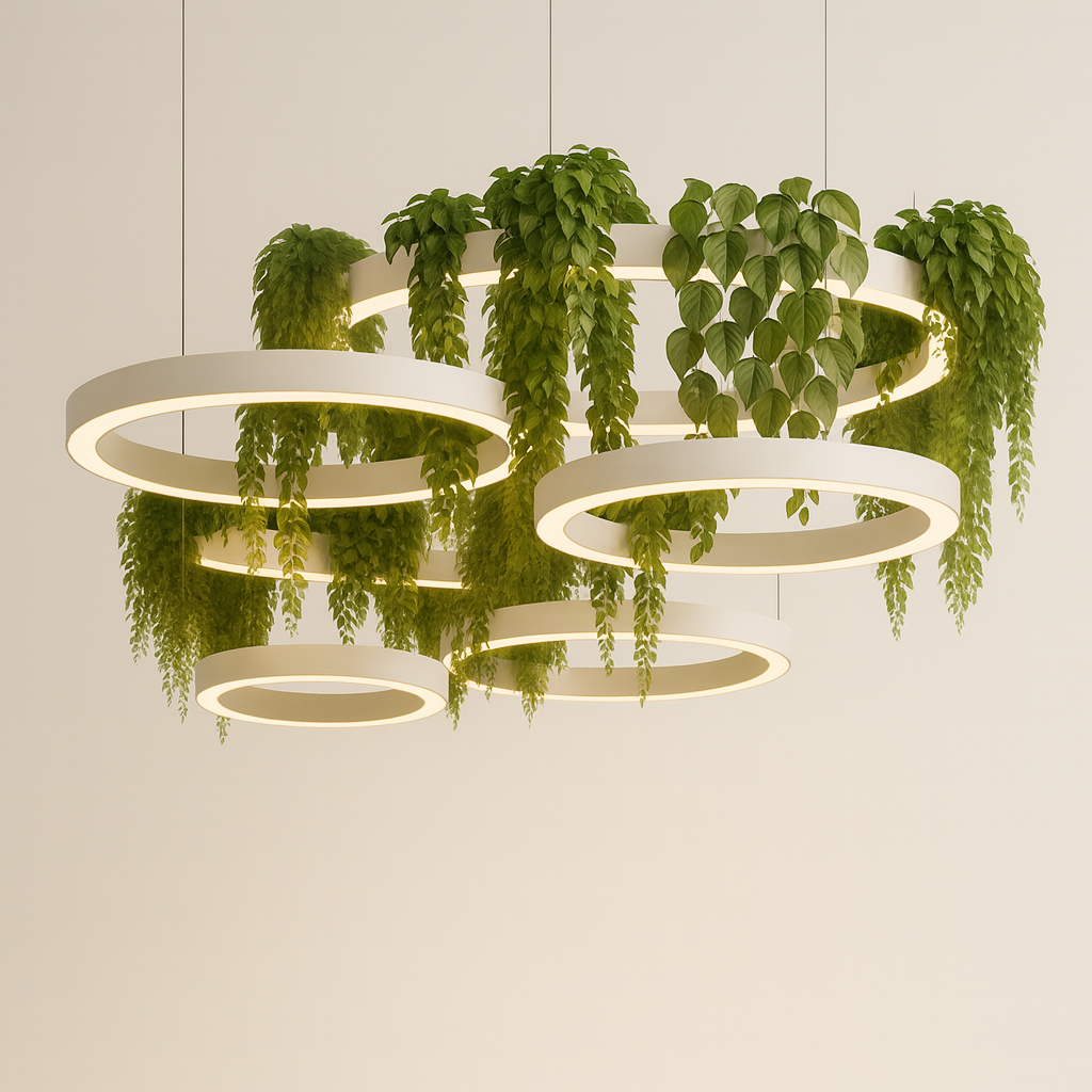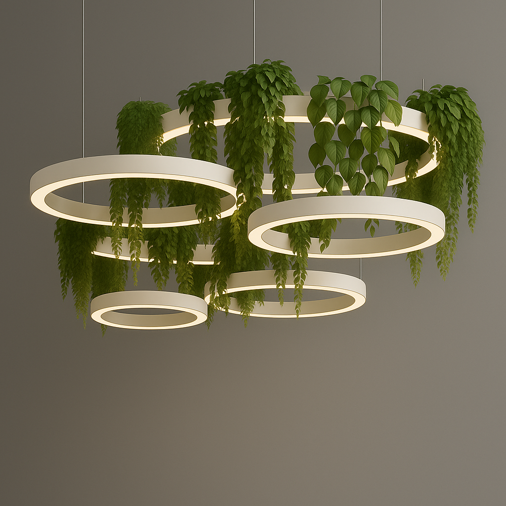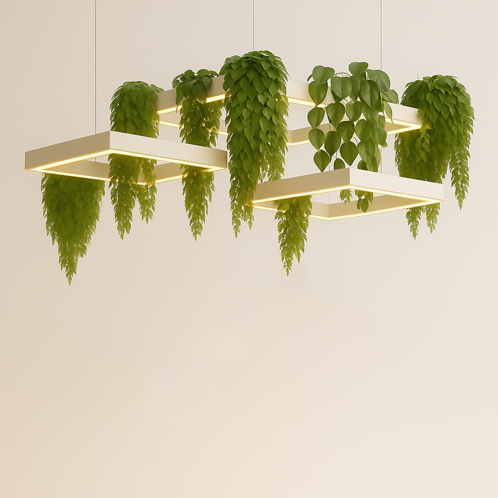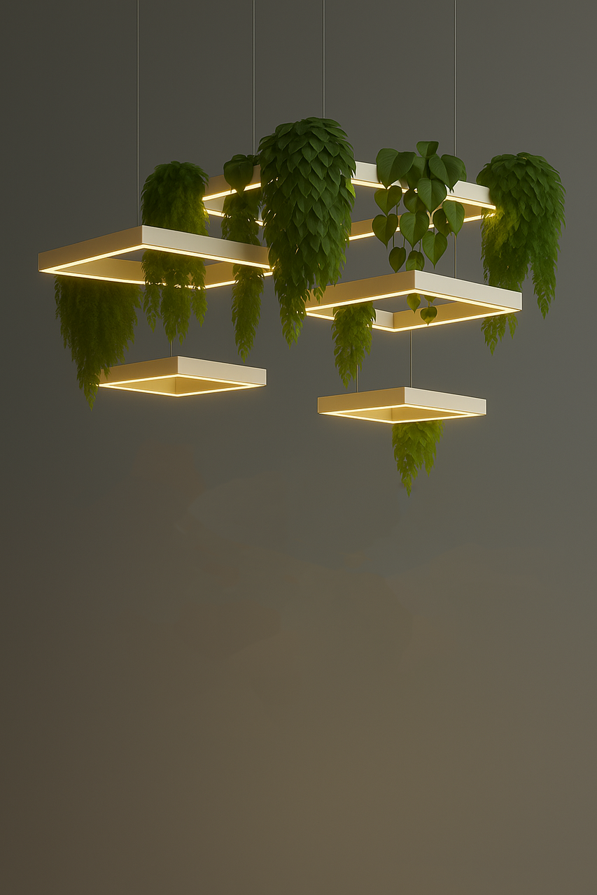 This botanical linear pendant combines modern minimalism with natural harmony, featuring a slim aluminium and plexiglass structure designed to showcase lush greenery while providing high-quality LED illumination.