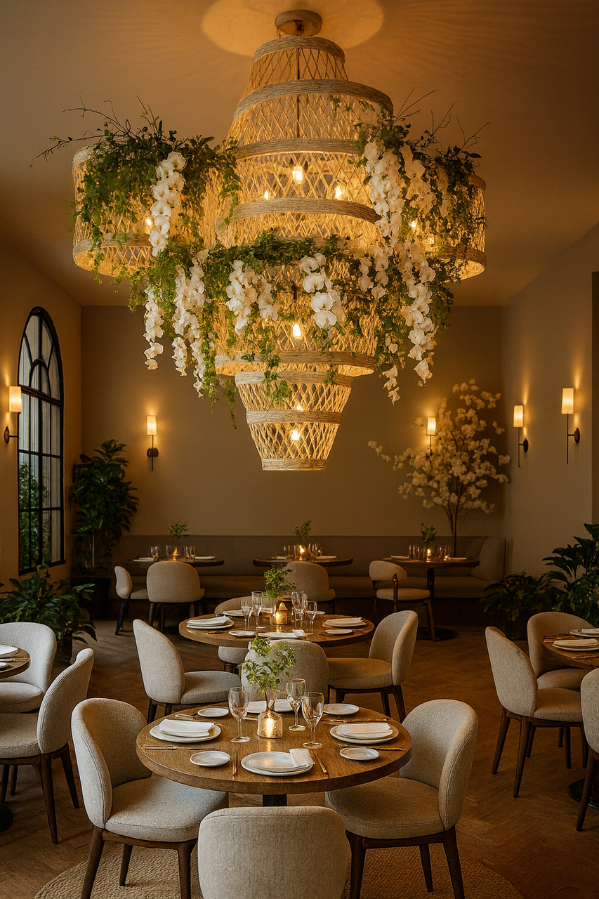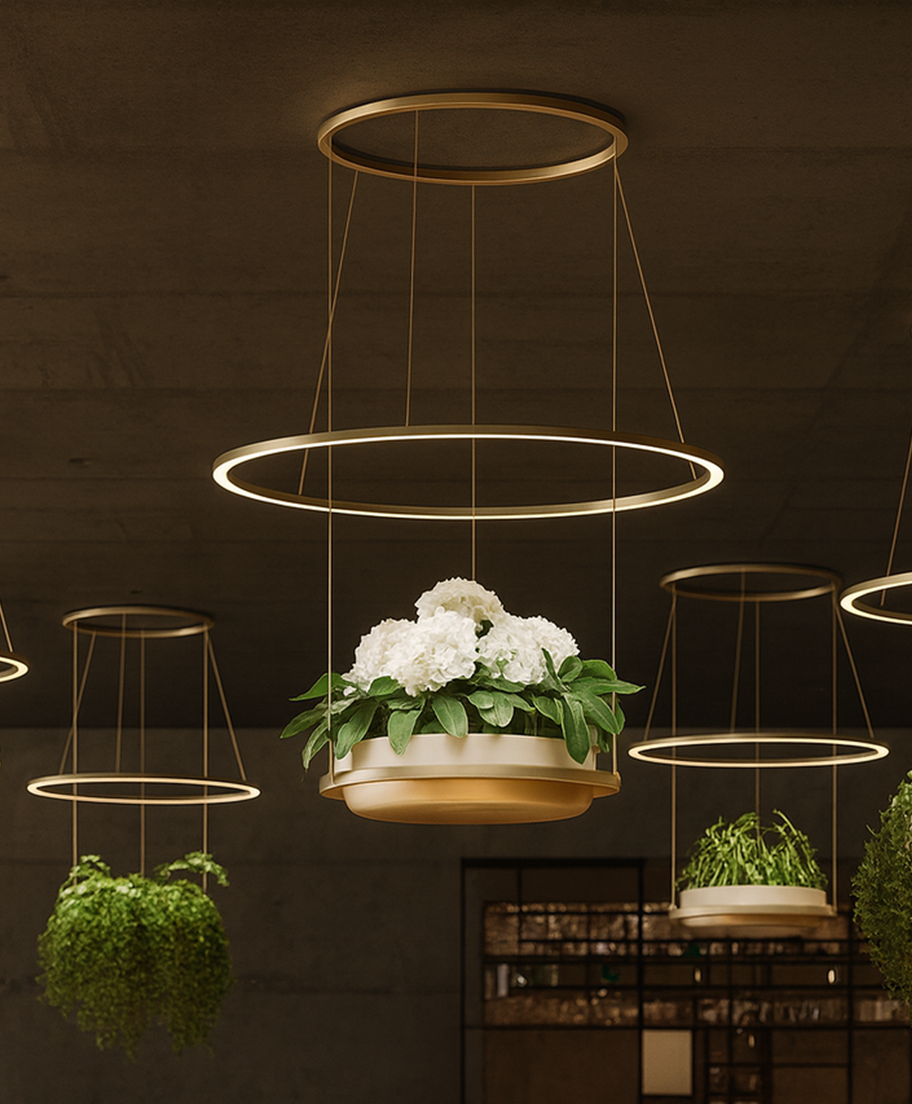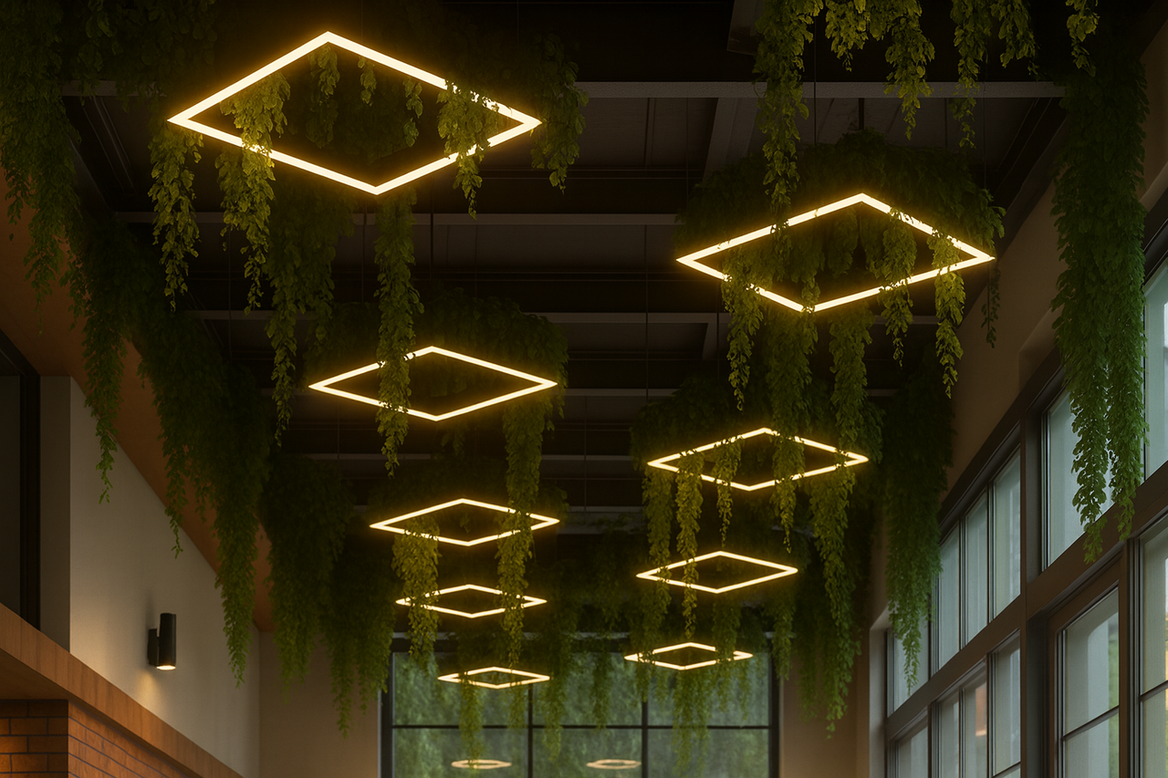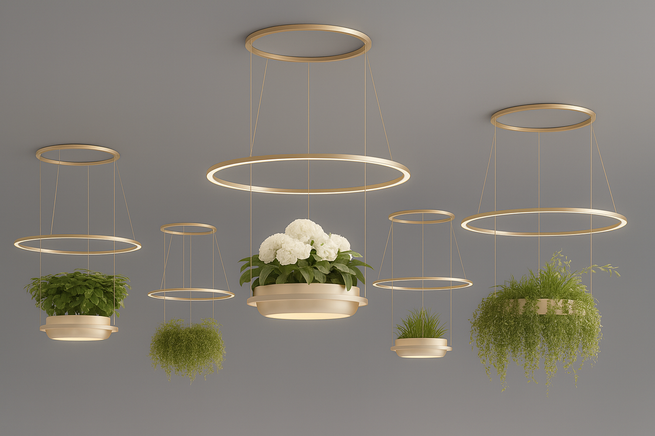 This botanical linear pendant combines modern minimalism with natural harmony, featuring a slim aluminium and plexiglass structure designed to showcase lush greenery while providing high-quality LED illumination.