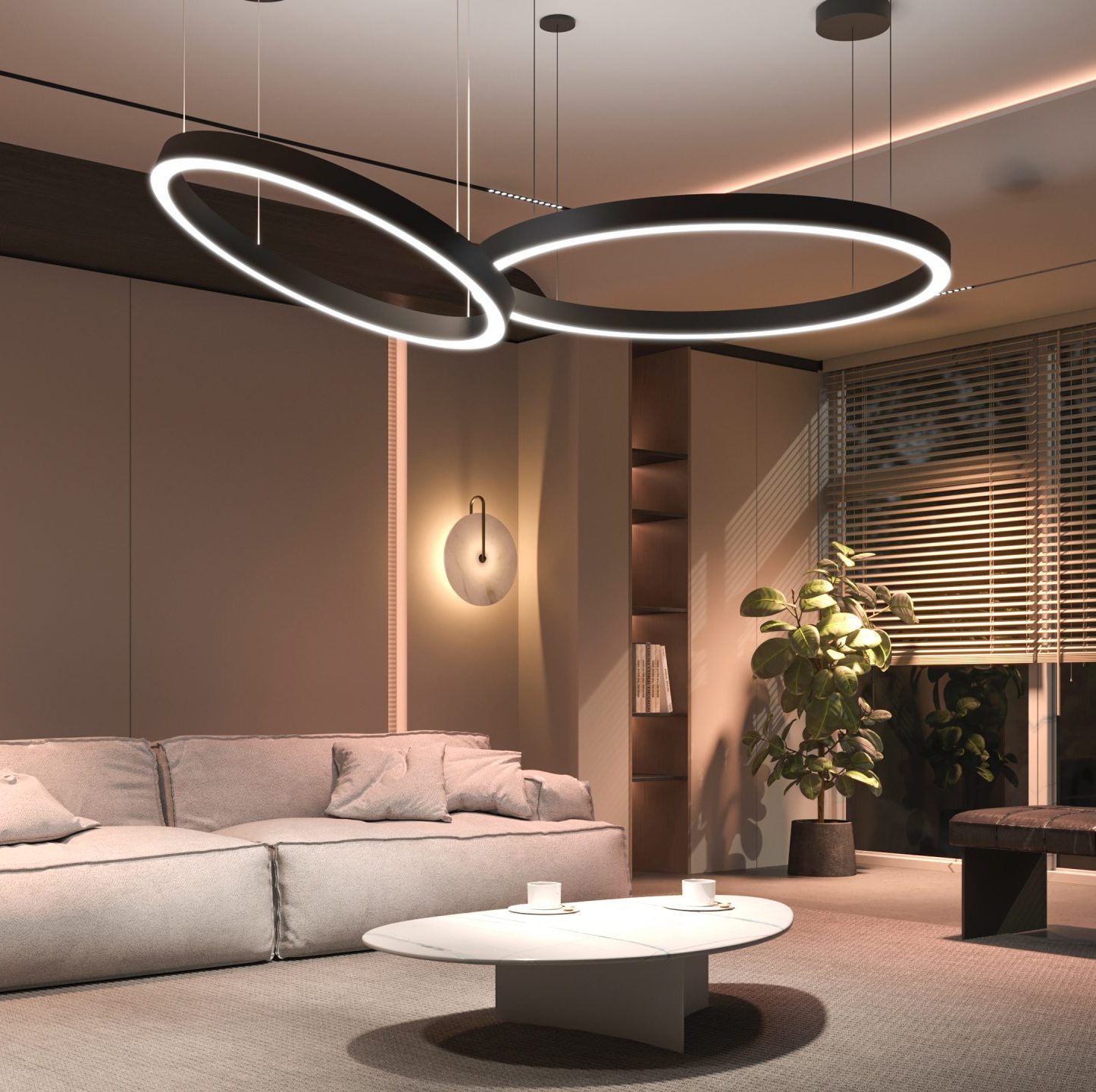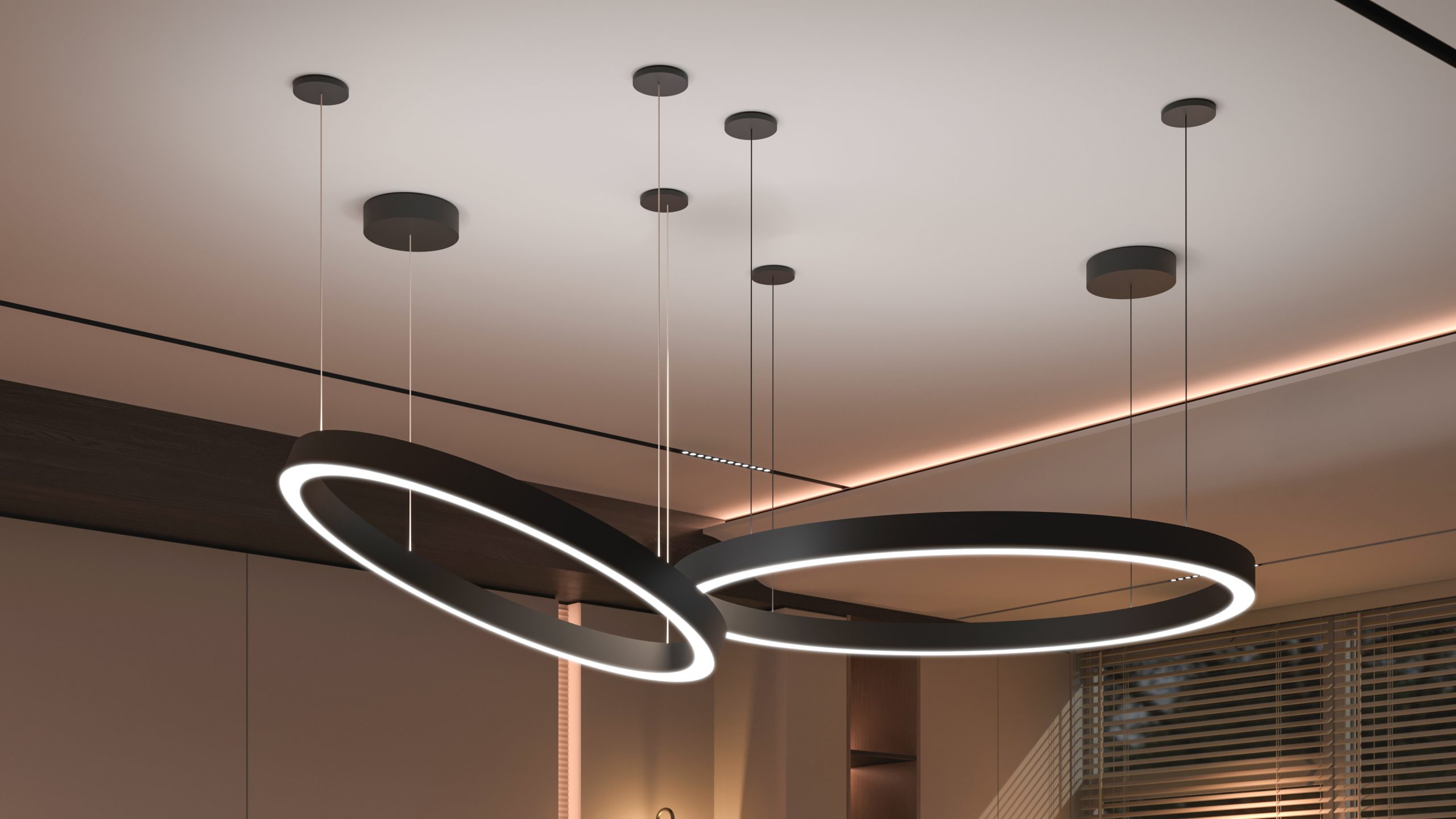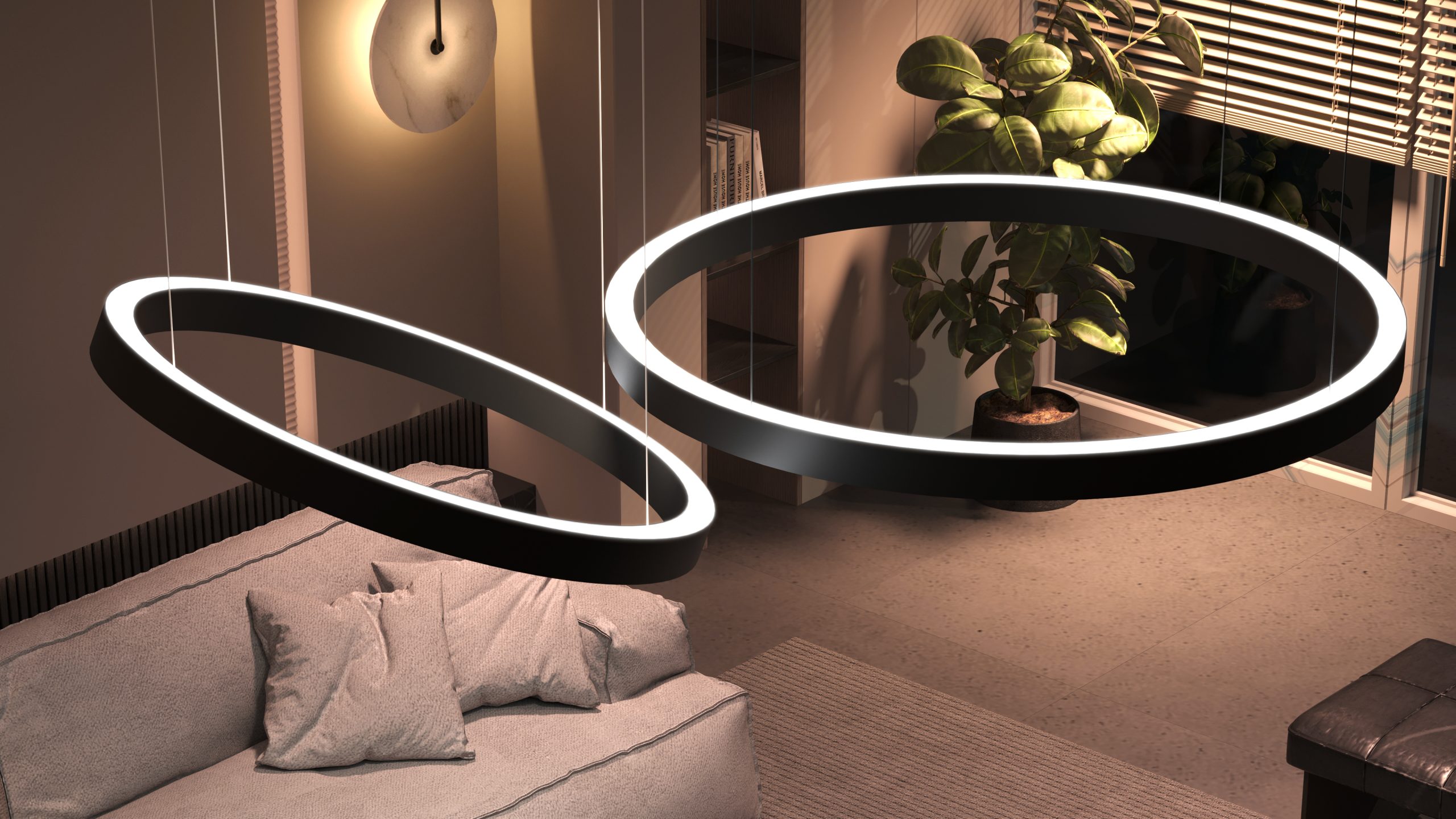 HALO SINGLE FIXTURES is a luminous hanging ring with LED lighting and available in 5 standard sizes: 19.29″, 25.20″, 29.92″, 39.37″, 47.24″. 360° lighting – 2700K, 3000K.