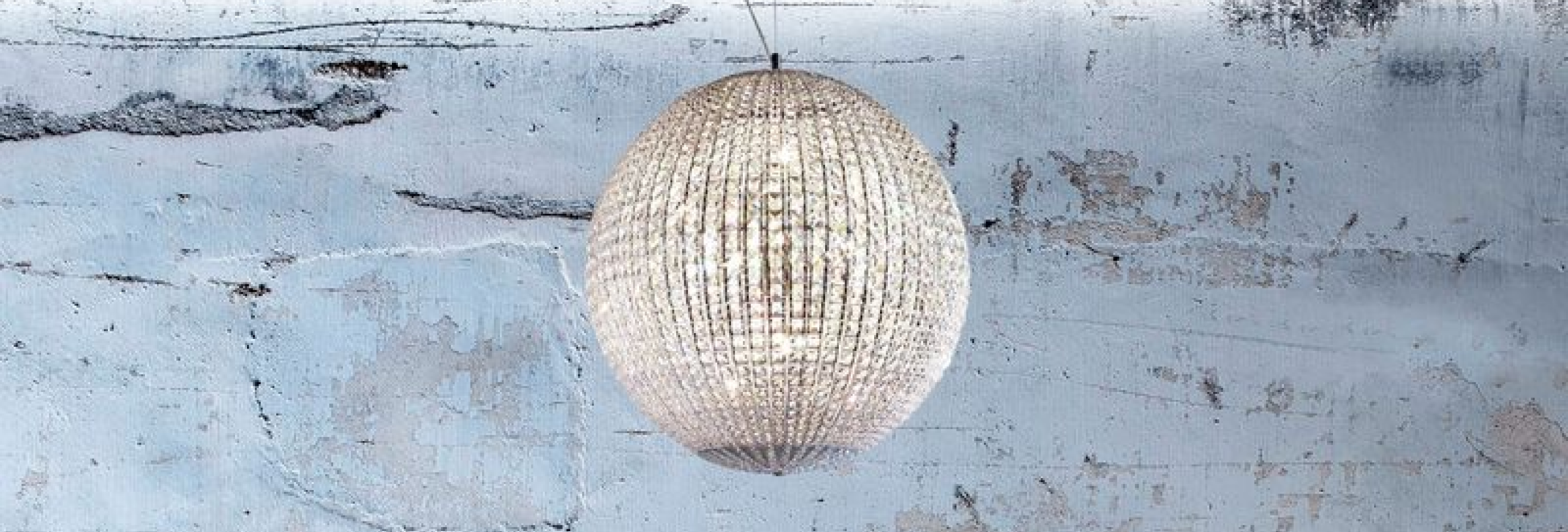 The spherical and half-spherical shades is entirely crimped with glass crystals. The square crystals are arranged in regular rows, in accordance with modern design principles.