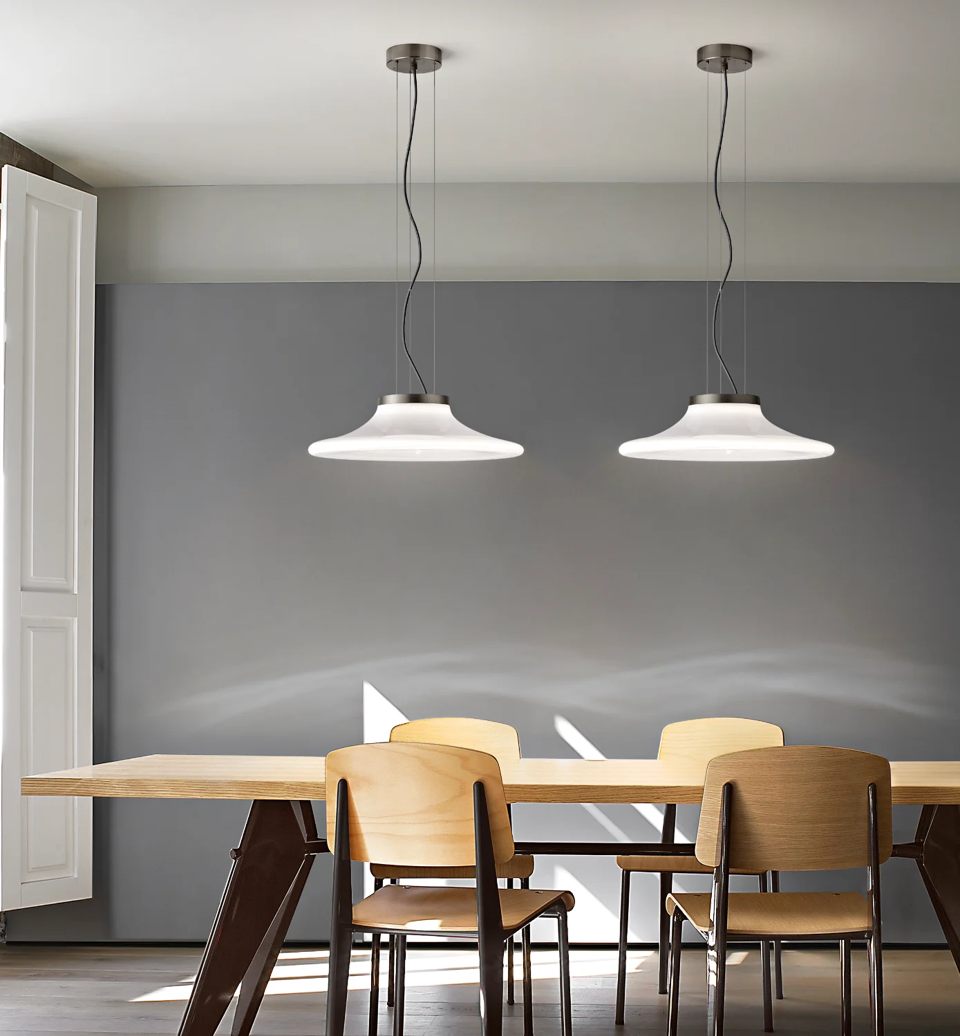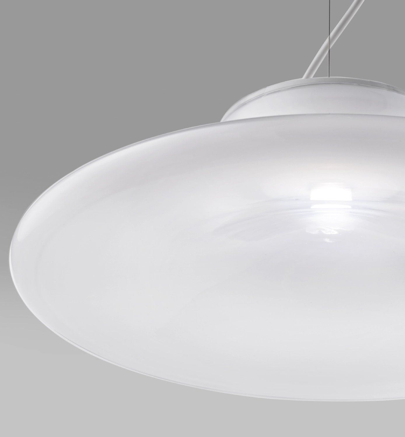 Featuring a wide, softly curved glass shade in a White Shaded finish, it delivers a gentle, diffused glow that creates a warm and inviting atmosphere.