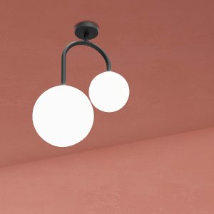 An arched bracket holds two lampshades made of satin-finished glass by means of cup-like connections in the air.