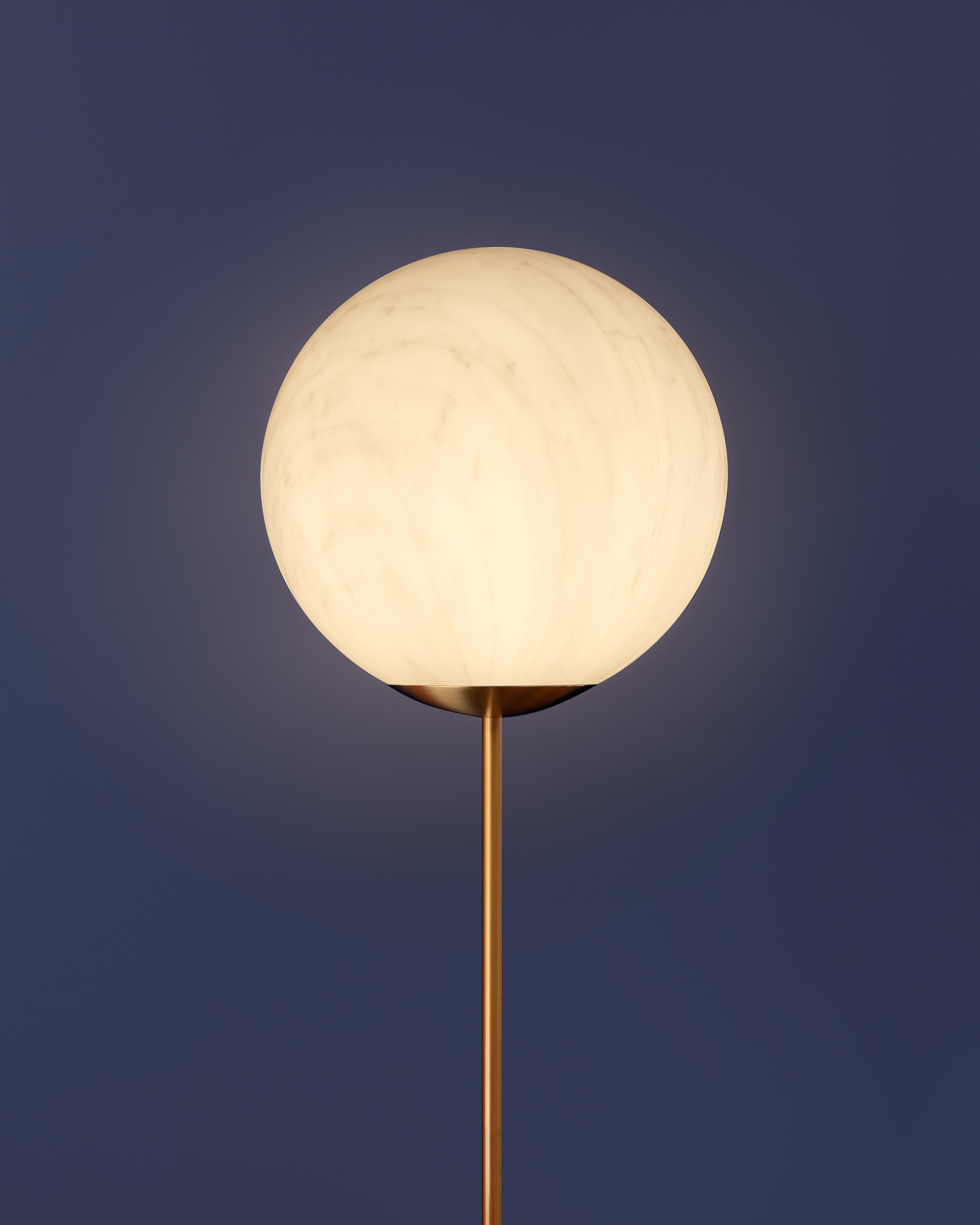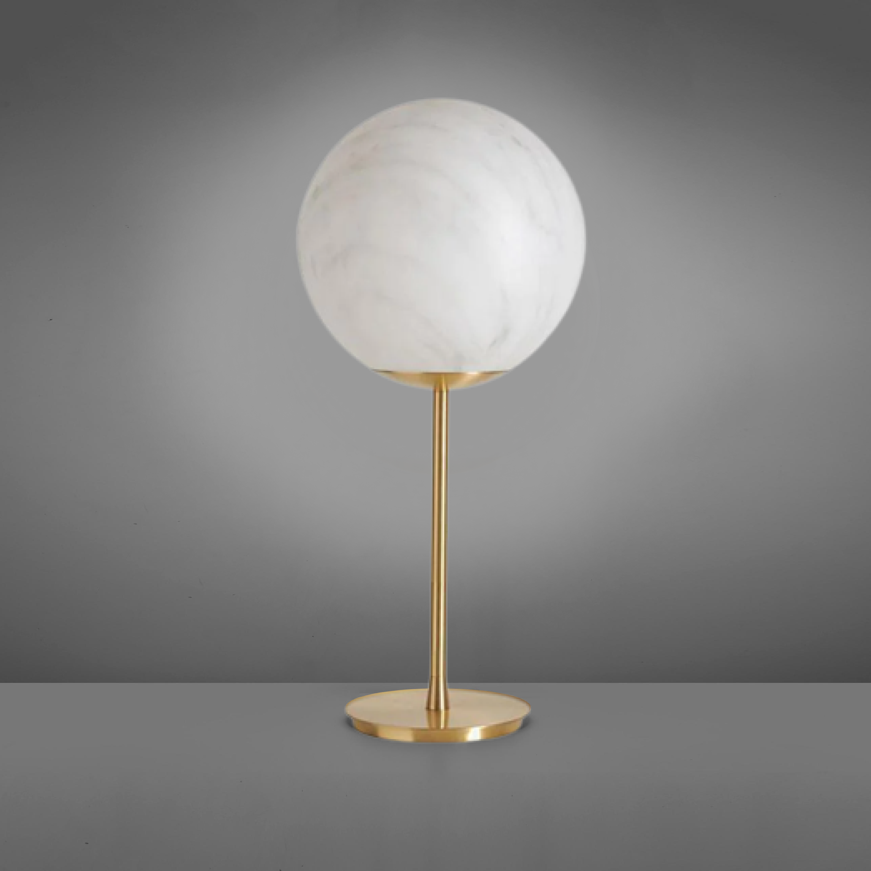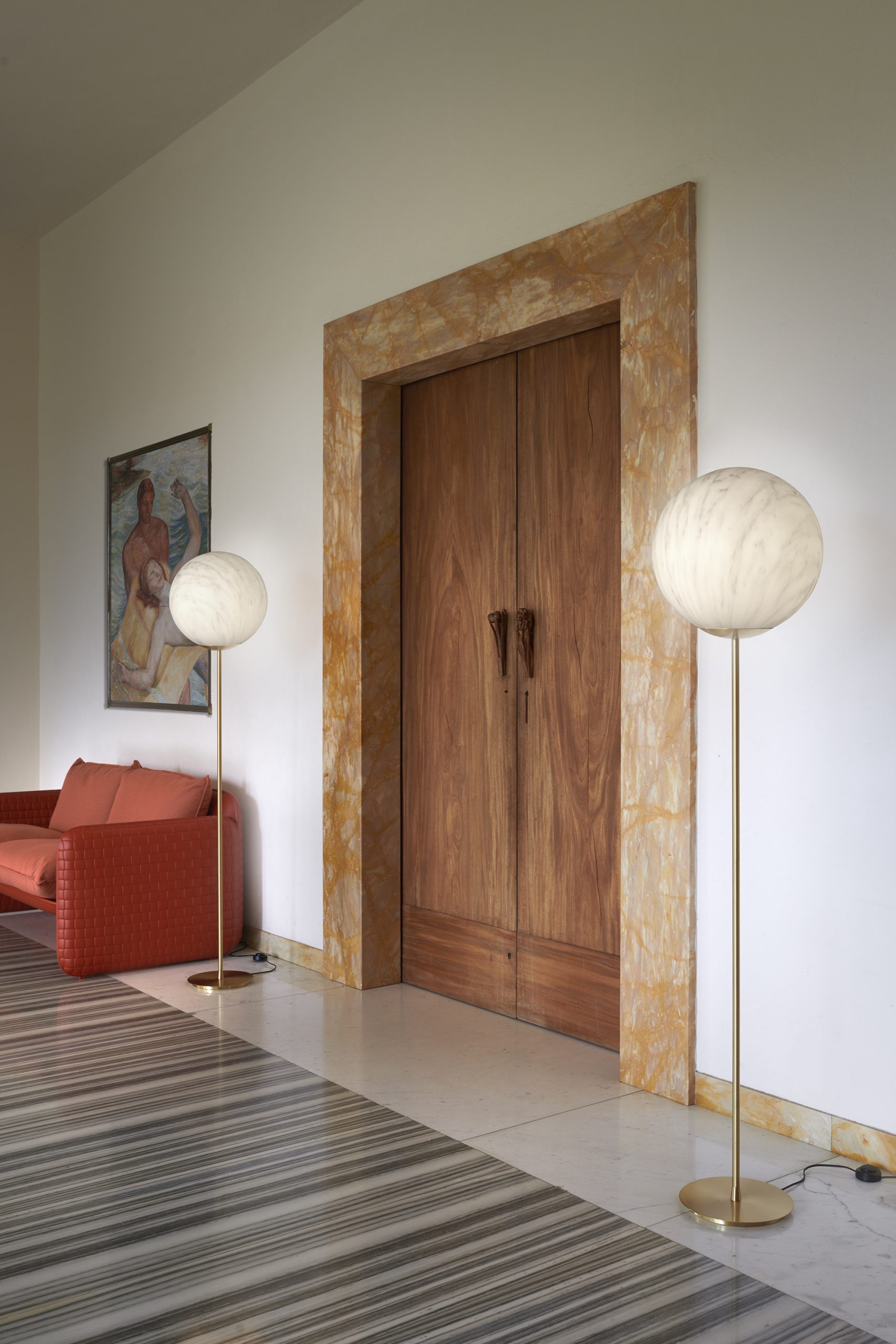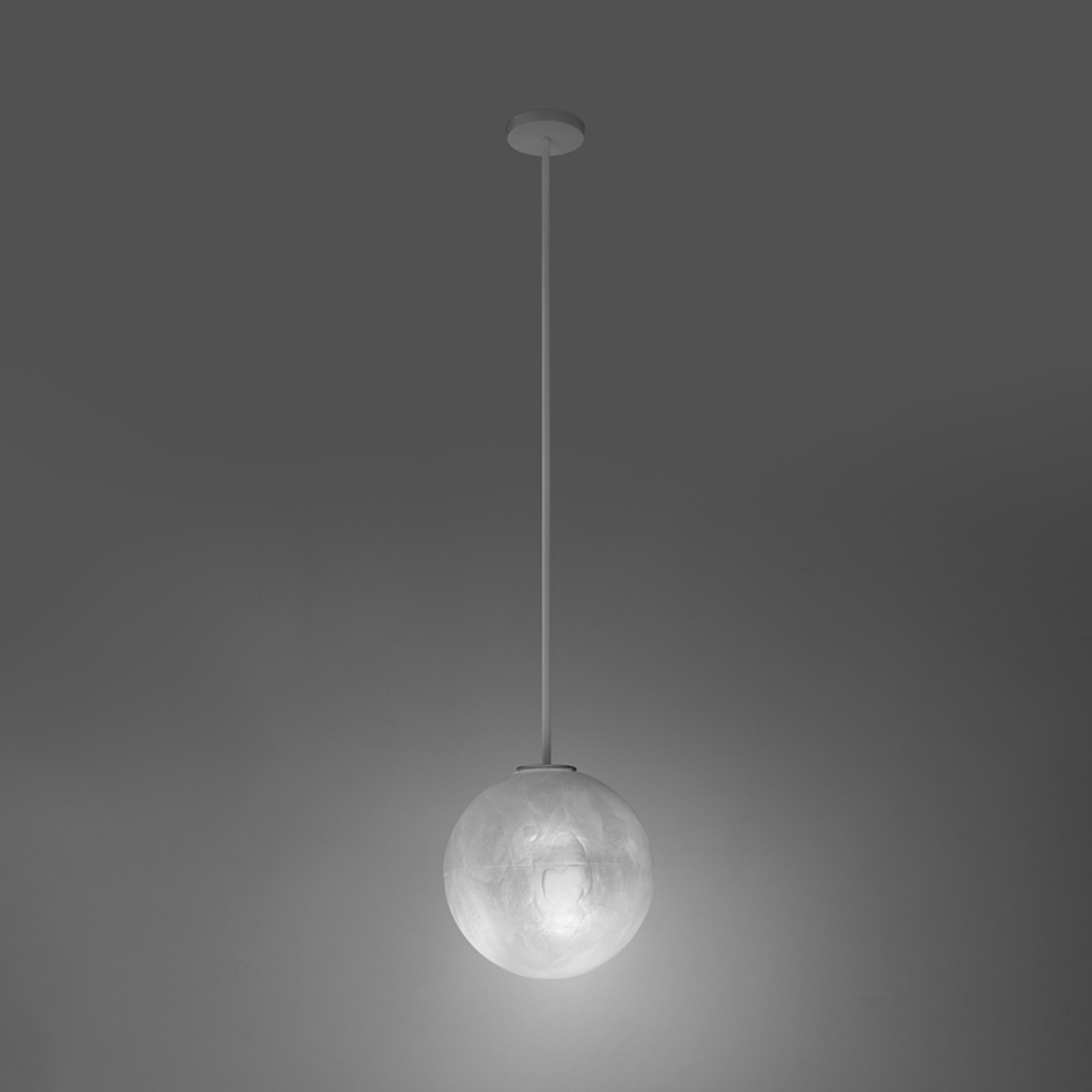 The marble-like lampshade, with grey or red veinings, matches with the stem available in two different lenghts and in brass or painted iron.