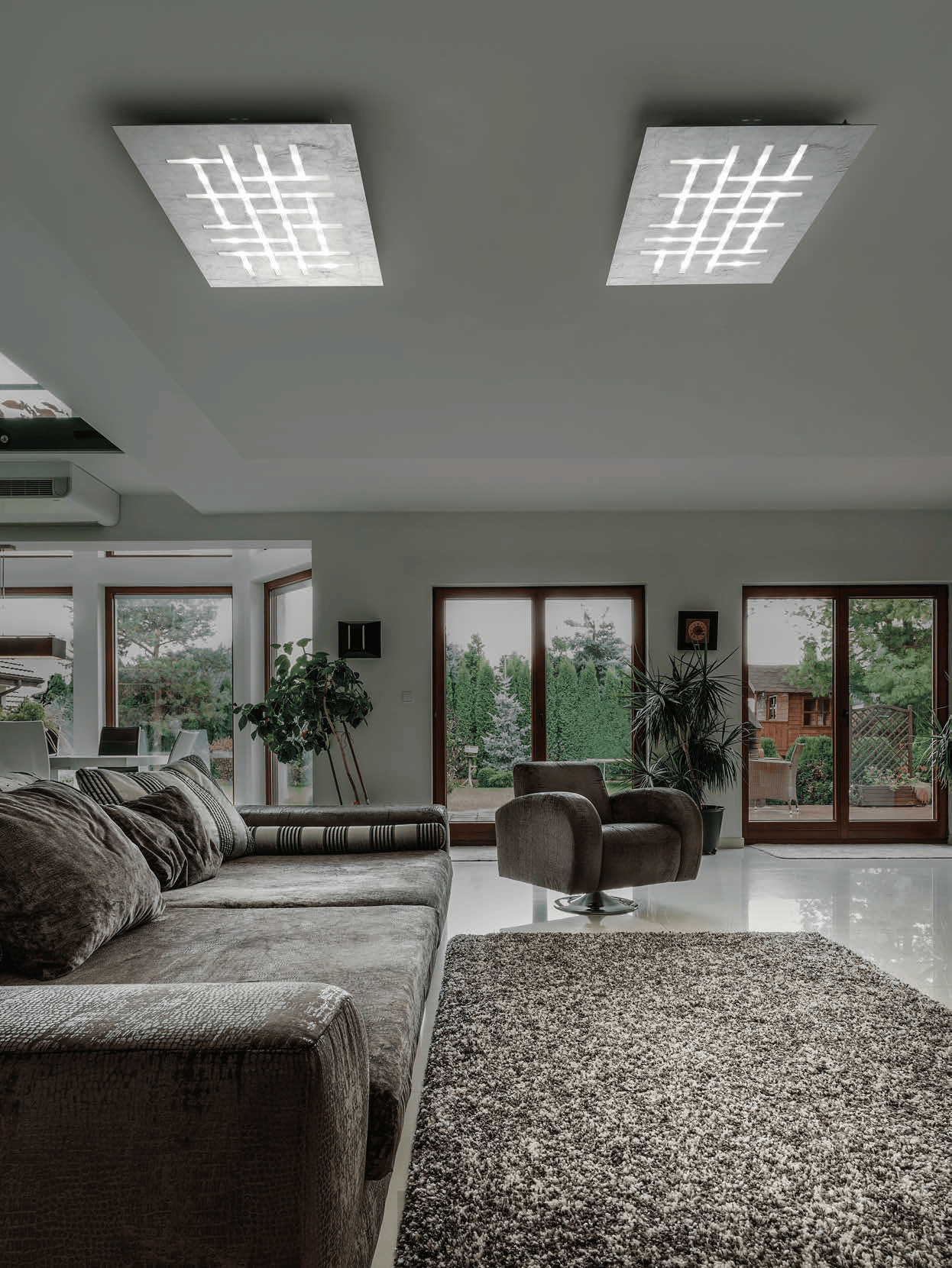 The Pattern C offers a bold and contemporary statement, featuring a square or rectangular form with a striking beam-down lighting effect.