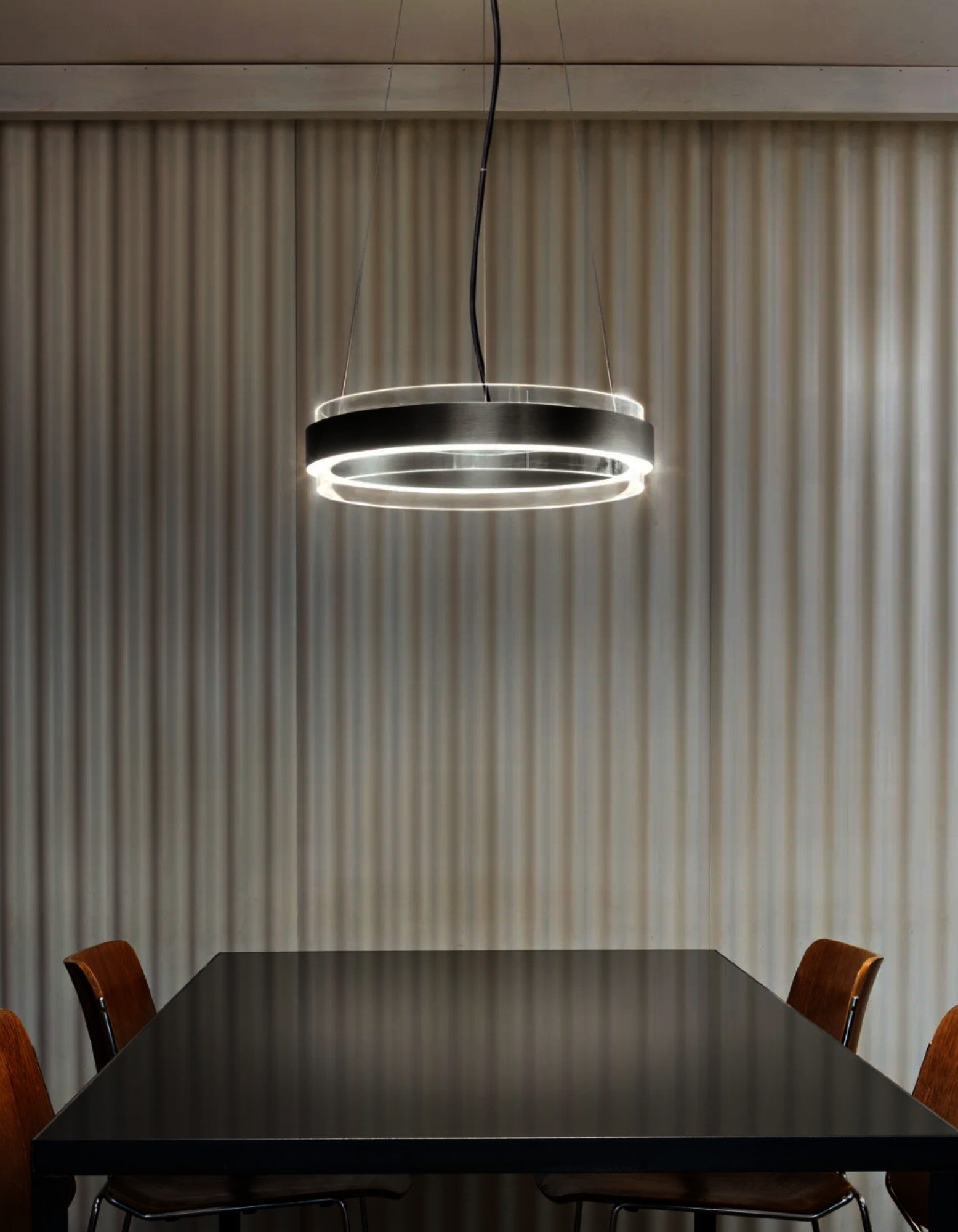 Direct lighting defines the area of light below, enhancing the natural beauty of the smoky, amber and crystal tones embellished with black nickel and copper finishes.