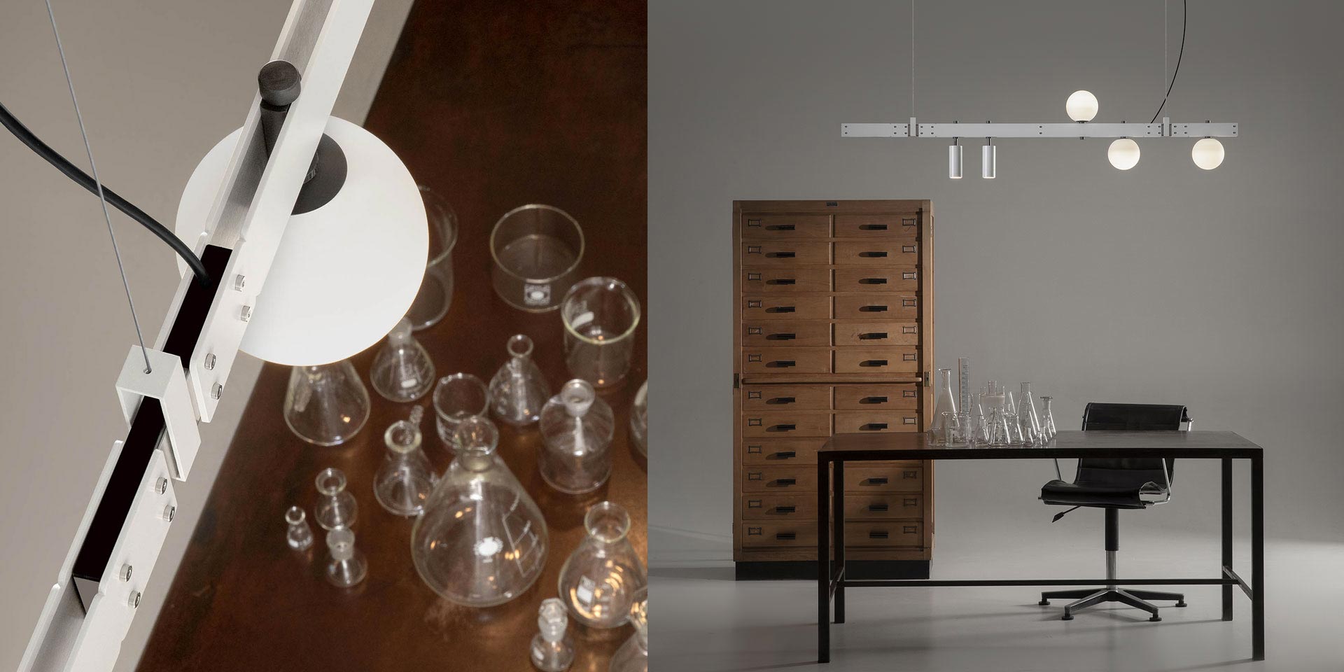 Structure and spotlights in matt white aluminum and spheres in white frosted glass (also available in black version)