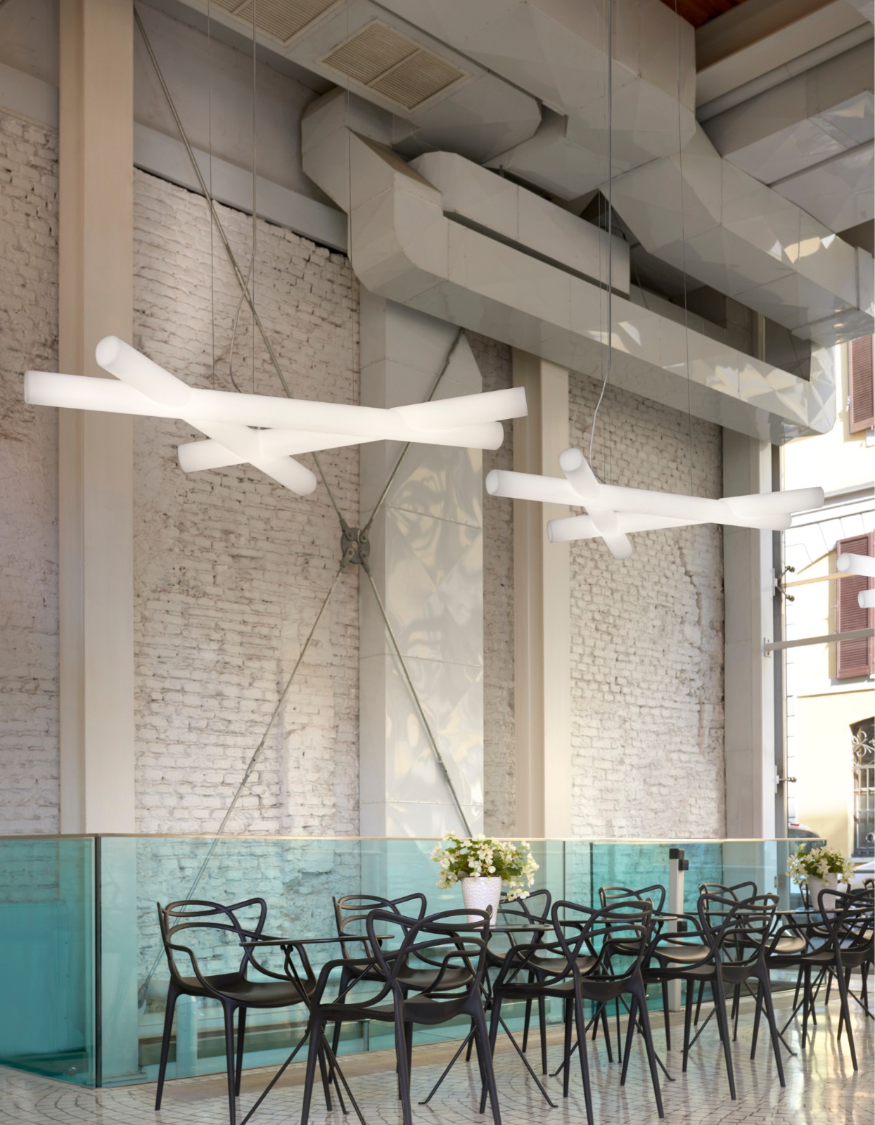 The curved light circle radiates its warm white LED light evenly and is harmoniously distributed in the room by the opal-coloured diffuser. Thanks to the latest LED technology, the Tape is extremely energy-efficient in operation. Thanks to the decentralised canopy, as well as the 2-metre cable length of the respective luminaire, you have the possibility to create very individual lighting situations. This gives you maximum design freedom. The twisted light bodies create a natural lightness and thus fit into any living space situation.