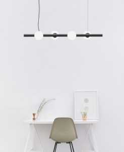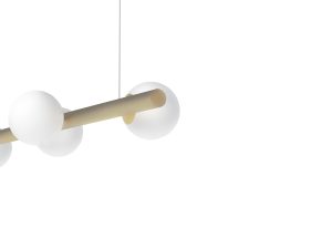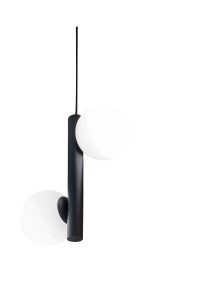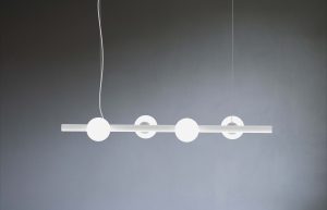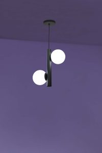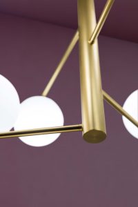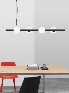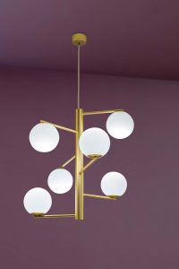 Two geometric shapes, cylinder for the metal parts and spheres for blown glass, coexist in harmony creating atmospheres that can easily assimilate.